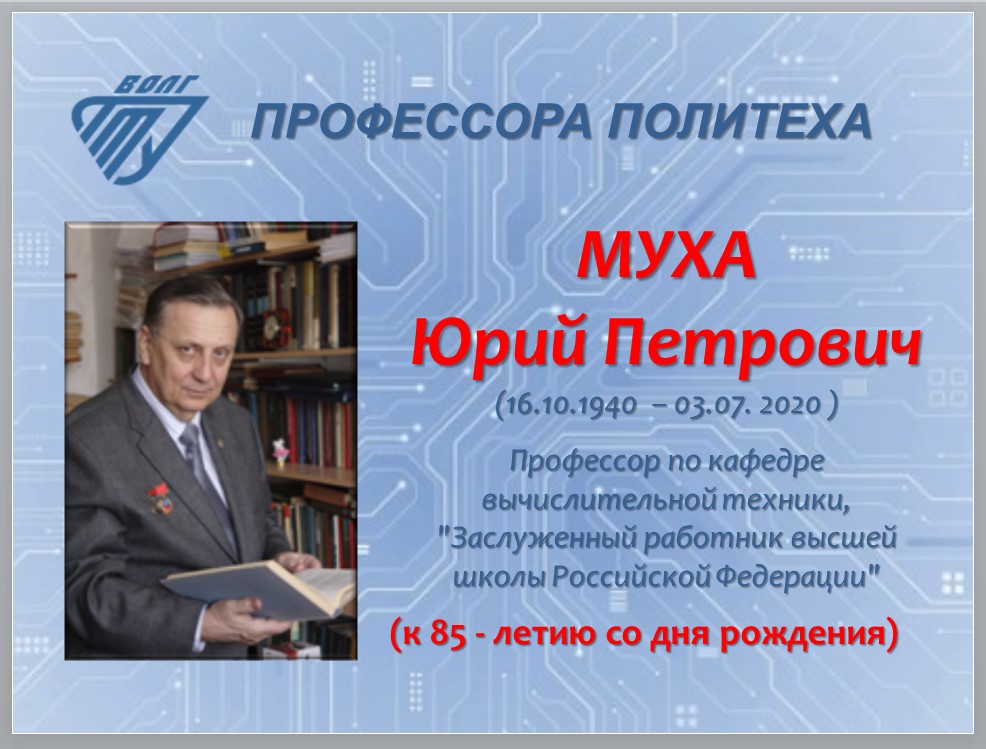 16 октября исполнится 85 лет со дня рождения Юрия Петровича Мухи (16.10.1940 – 03.07.2020) профессора по кафедре вычислительной техники, "Заслуженного работника высшей школы Российской Федерации".