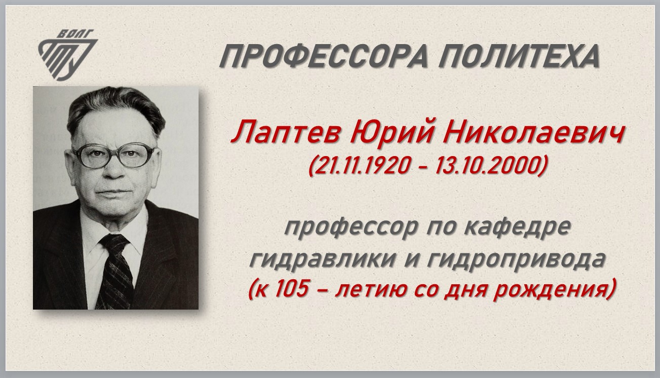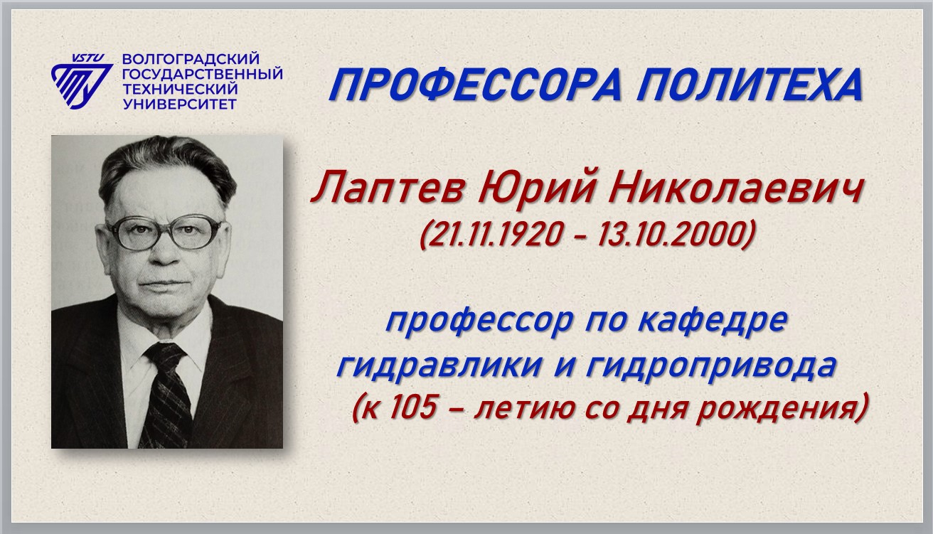 105 лет со дня рождения Юрия Николаевича Лаптева (21.11.1920 - 13.10.2000) профессора по кафедре гидравлики и гидропривода