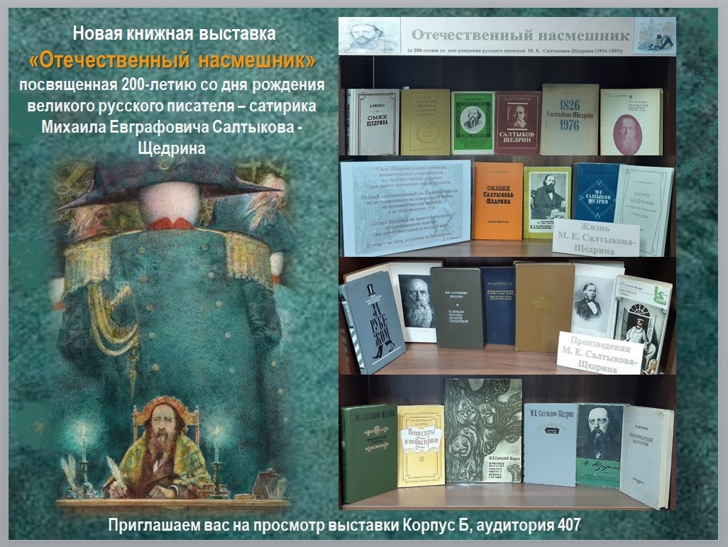 в отделе социально-гуманитарной литературы (Корпус Б - ауд.407) открылась новая книжная выставка «Отечественный насмешник» посвященная 200-летию со дня рождения Михаила Евграфовича Салтыкова – Щедрина (27.01.1826-10.05.1889) русского мыслителя, писателя-сатирика и публициста XIX века.